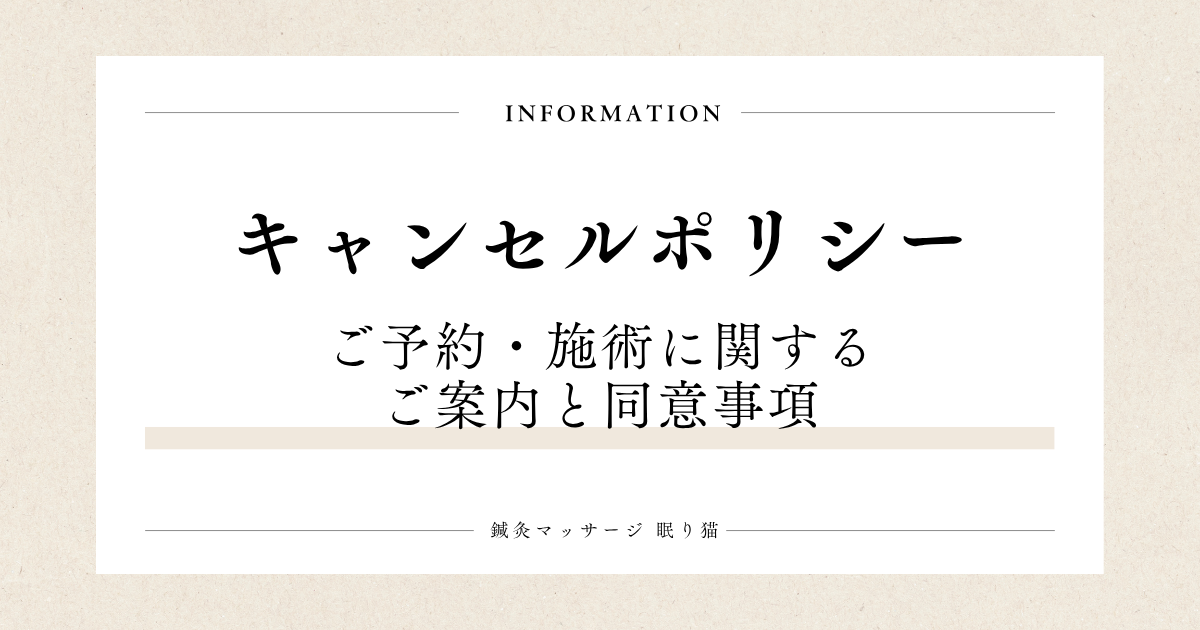 ・予約時間からご連絡なく15分以上経過した場合は【無断キャンセル】とみなし、【施術料金の100%】を頂戴いたします。