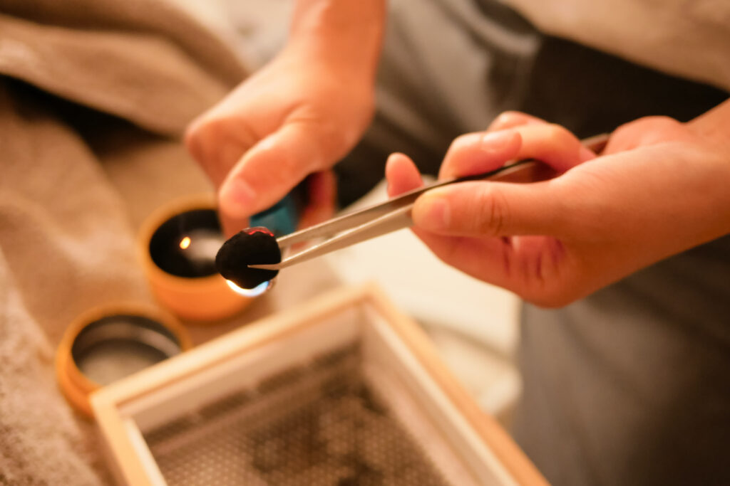 箱灸は、もぐさの熱をじんわりと広い範囲に伝えるケア。