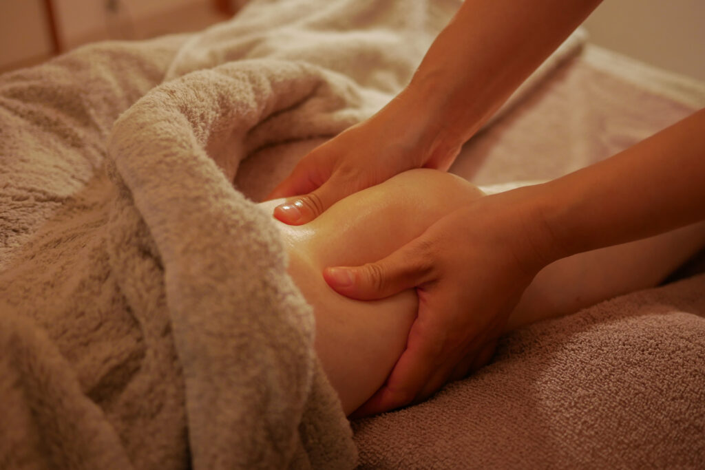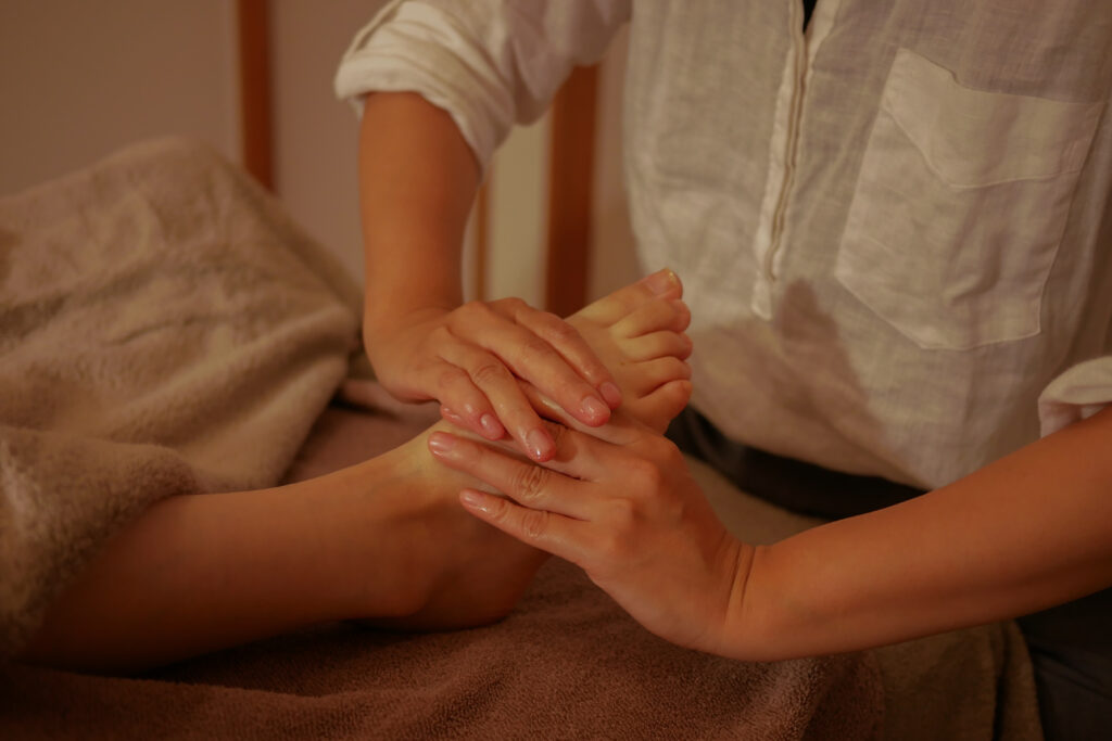 施術後半では、**足裏〜ふくらはぎまでのオイルマッサージ(40分)**で、